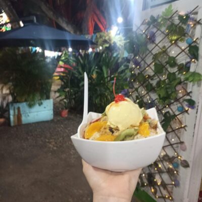 Venta de ensaladas de frutas, jugos, malteadas y comida rápida preparada con dedicación.